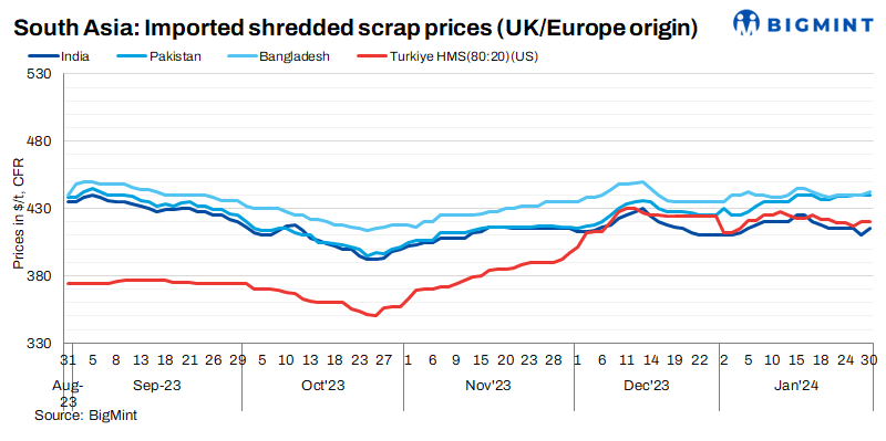 Pakistan: Demand for imported scrap in Pakistan remained slow due to the upcoming February elections. Indicative offers for shredded scrap from Europe were assessed at $435-440/t CFR Qasim, while offers from the Middle East were heard at $455-460/t CFR for shredded scrap and $410-415/t CFR for HMS scraps.