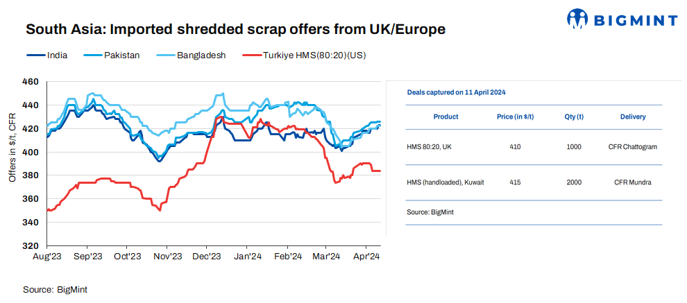Today, in the South Asian ferrous scrap market, there was a moderate level of activity. Indian buyers chose to adopt a cautious stance. Offers for shredded and HMS (80:20) from Europe were assessed at $420-425/t CFR and $395/t CFR. Market activity in Pakistan and Bangladesh was minimal due to the observance of Eid, with operations expected to resume around 15 April.