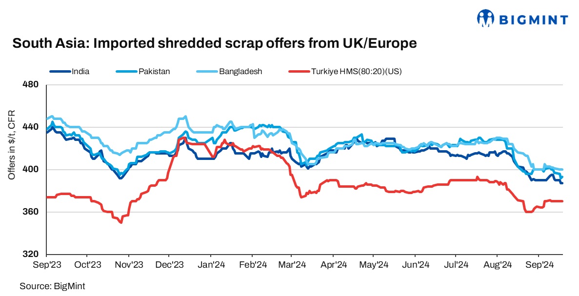 Supply glut prompts production cuts in Pakistan: Pakistani buyers showed little interest in imported scrap, as the domestic steel market remained weak. Steel mills have reduced production due to high inventory levels and weak rebar sales, leading to lower scrap consumption. Indicative offers for shredded scrap from the UK/Europe were at $390-395/t CFR Qasim.