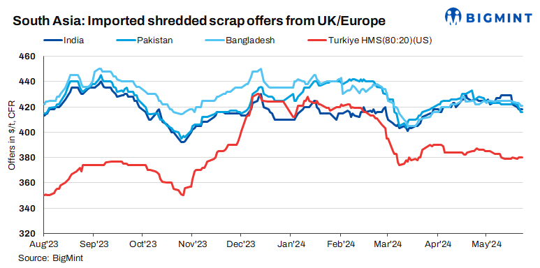 Shredded scrap offers remained unchanged in India, Pakistan and Bangladesh. Moreover, bulk HMS (80:20) offers from US to Turkiye were also stable d-o-d.