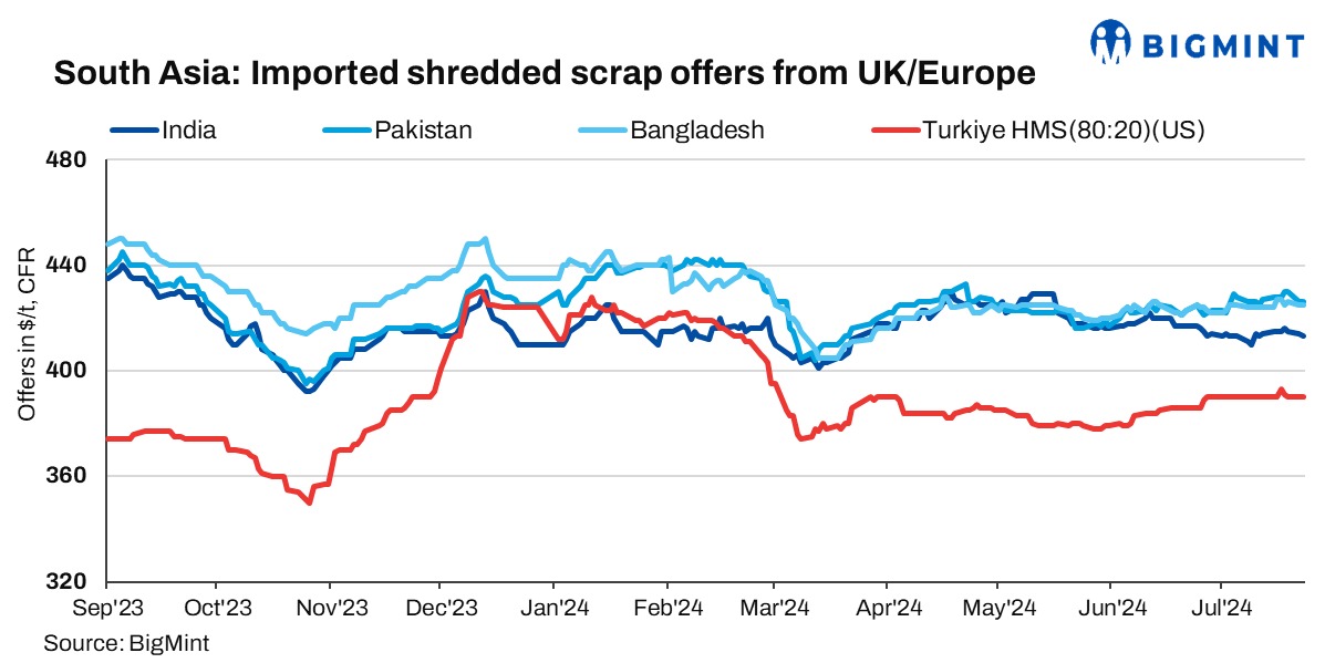 Bangladesh: Imported ferrous scrap inquiries remained minimal in Bangladesh due to violent civil unrest and a worsening economic crisis. Indicative offers for shredded scrap from the UK/Europe were reported at $420-425/t CFR, while HMS (80:20) was offered at $405-408/t CFR.