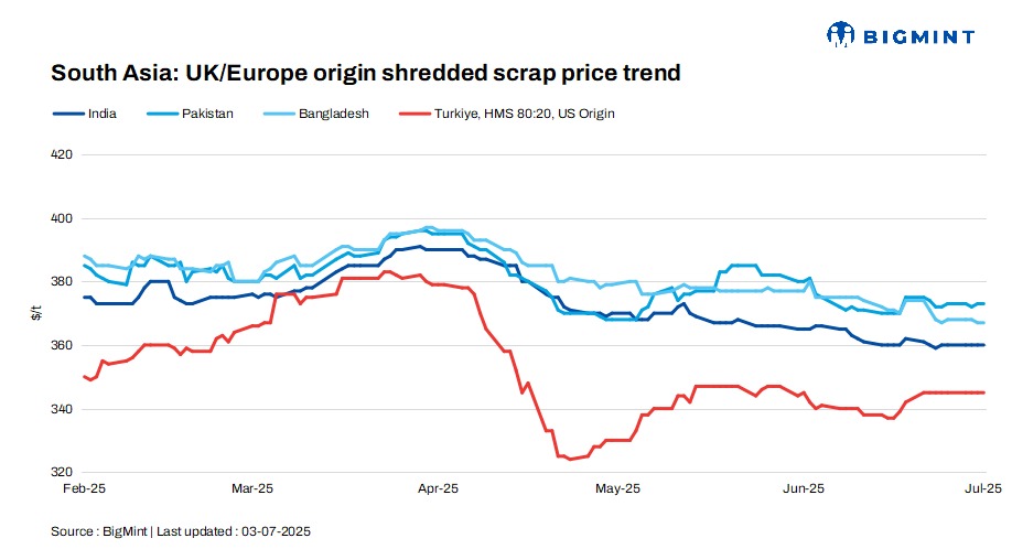 Bangladesh: Bangladesh’s imported scrap market extended its subdued trend in early July, with buying activity restrained by seasonal monsoon effects, a post-Eid production slowdown, and weak construction demand. Mills steered clear of prompt shipments, instead eyeing August-September arrivals.