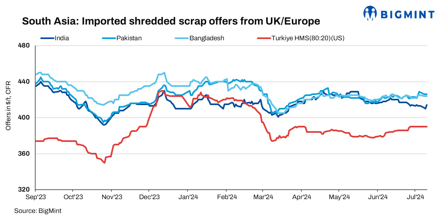The South Asian ferrous scrap market showed mixed trends today. India’s demand remained slow due to bid-offer disparities and a sluggish domestic steel market. Pakistani buyers adopted a need-based approach, while Bangladeshi buyers faced delays in LC approvals. Shredded scrap offers from the UK/Europe were: