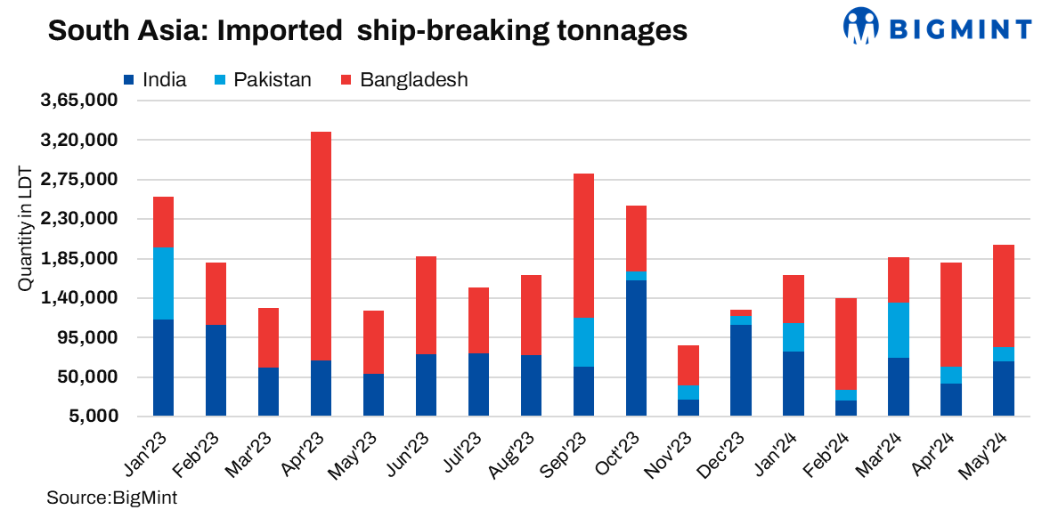 Bangladesh reported the highest tonnage at 115,831 LDT, though this was a 2% decrease from 118,231 LDT in April. India followed with 67,854 LDT, showing a significant 58% increase from 42,925 LDT in April. Pakistan reported a decline, with tonnage falling by 14% m-o-m to 16,569 LDT.