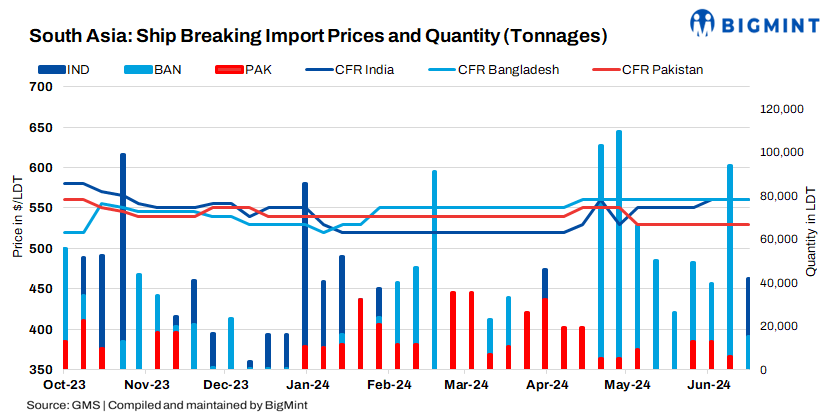 The South Asian ship recycling market experienced a dynamic week, with notable fluctuations and developments in India, Pakistan, and Bangladesh. Political shifts, economic policies, and market conditions played crucial roles in shaping the sector’s performance. In India, cautious optimism prevailed post-elections as current government’s third term began, signalling potential stability despite fiscal uncertainties. Pakistan’s market faced a standstill due to stringent fiscal measures aimed at securing IMF loans, impacting vessel acquisitions and pricing. Bangladesh encountered significant challenges with weakened bidding appetites and restrictive financial policies, compounded by an unsupportive budget.