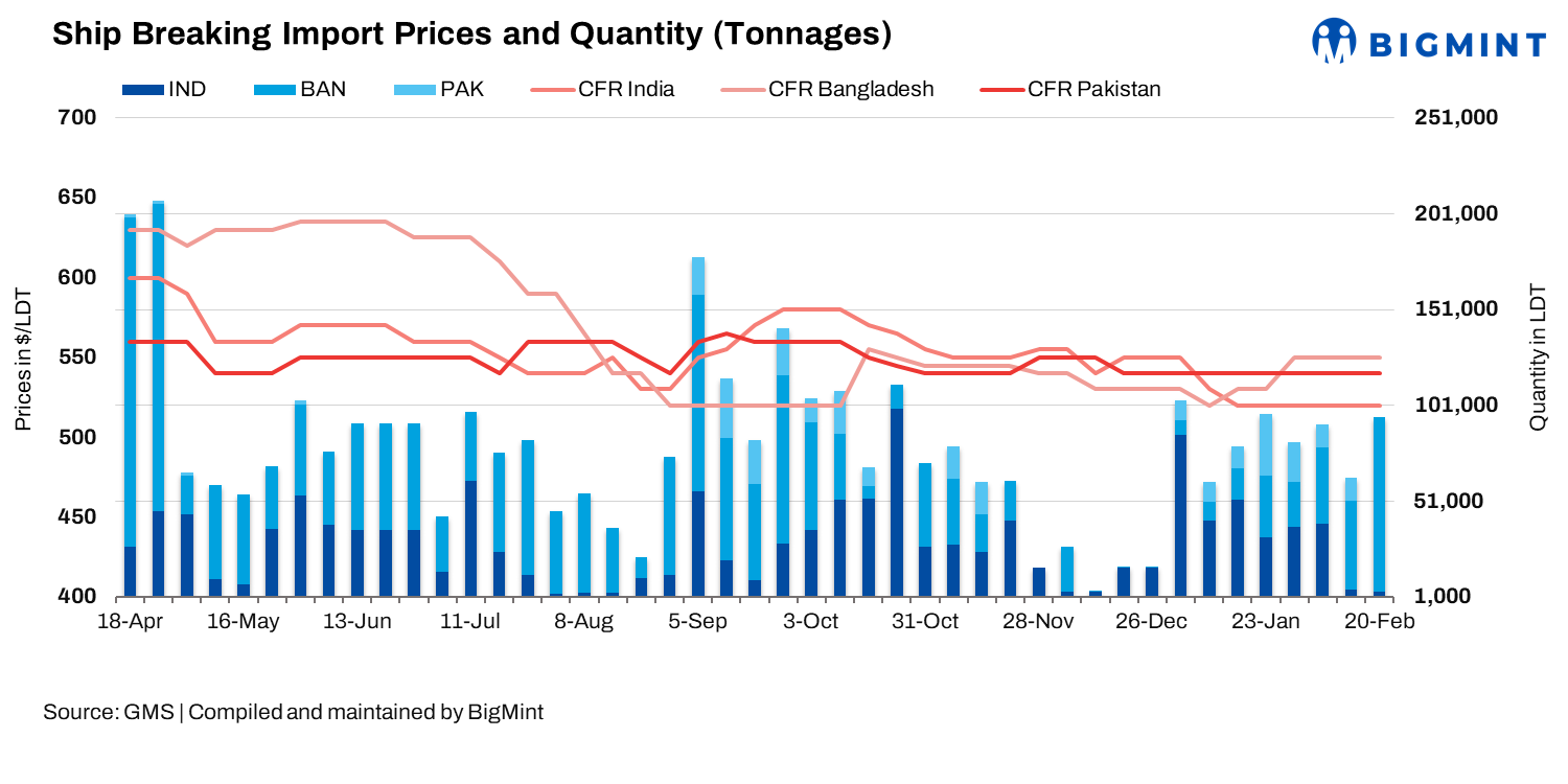 Following Pakistan’s recent general elections and the announcement of a coalition government, the country appears to be settling into a period of relative calm after pre-election uncertainty and violence. With the easing of LC issuance for vessel recycling following reports of an IMF loan agreement, demand from Gadani Recycles has surged. However, this comes at a time when tonnage availability is extremely limited, leaving local recyclers uneasy. Despite this, Gadani continues to face challenges due to ongoing vessel supply shortages and domestic volatility, with steel plate prices remaining stagnant as the Pakistani rupee (PKR) weakens against the US dollar.
