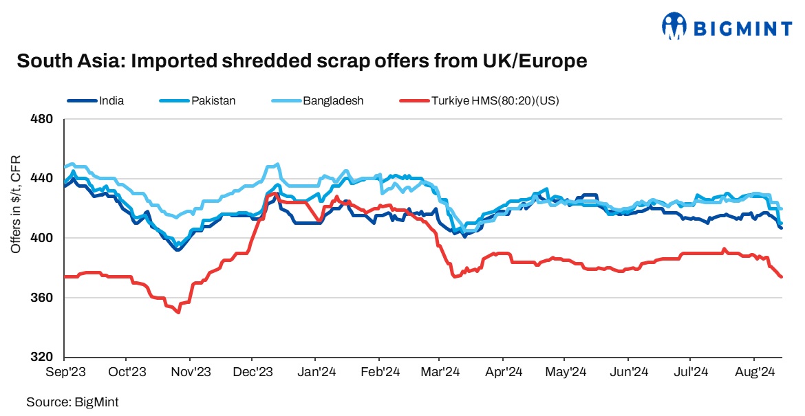 India: In India, demand for imported scrap has been sluggish, with buyers leaning towards more cost-effective domestic alternatives. The weakening domestic steel market has further dampened scrap consumption from this sector. Indicative offers for shredded scrap from the US and UK/Europe were in the range of $400-410/t CFR Nhava Sheva, but there were no takers, even at $400/t CFR.
