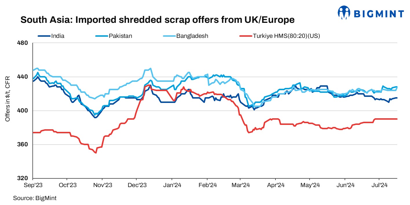 Bangladesh: Bangladesh’s imported scrap market remained slow as small and medium-sized mills faced financial issues. However, big buyers still showed interest in bulk cargoes. Steel demand continued to be dull due to limited buying activities, compounded by the monsoon season. Indicative offers for shredded scrap from the US and UK/Europe were heard at $420-430/t CFR, while HMS 80:20 was at $405-410/t CFR.