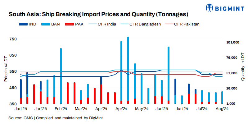 This instability made it difficult to contact local buyers, banks, agents, and authorities, complicating deal finalisations and vessel deliveries. Nonetheless, Bangladeshi recyclers continued receiving various domestic arrivals, from small 1,600 LDT vessels to larger 9,000 LDT bulk carriers. However, local buyers are nervous about the country’s economic future, with the taka fluctuating and local steel plate prices declining slightly.