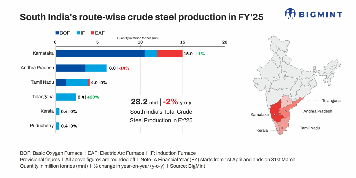 India’s crude steel production in the last fiscal (FY’25) stood at 152 million tonnes (mnt), as per BigMint data, and South India — comprising Andhra Pradesh, Karnataka, Tamil Nadu, Telangana, Kerala, and Puducherry — produced 28.2 mnt, a marginal decline from 28.8 mnt recorded in FY’24. Karnataka was the top producer, recording total output at 15 mnt, followed by Andhra Pradesh at 6 mnt, and Tamil Nadu at 4 mnt.