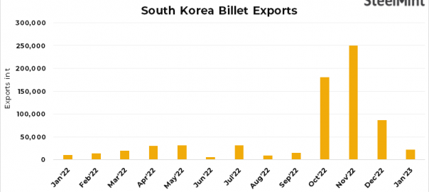 - South Korea’s steel billets exports fell sharply by 74% m-o-m to 22,323 t in Jan’23 compared to 86,629 t in Dec’22, as per customs data.