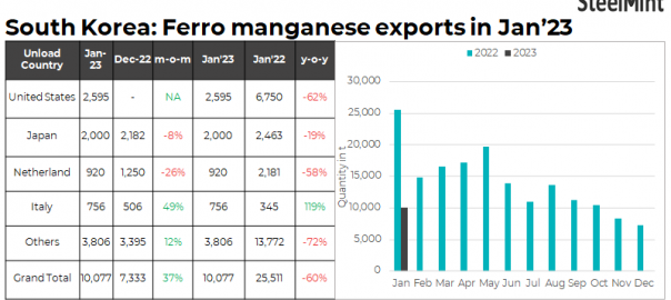 - South Korea’s ferro manganese exports increased by 37% m-o-m to 10,077 t in Jan’23 against 7,333 t in Dec’22, as per customs data.