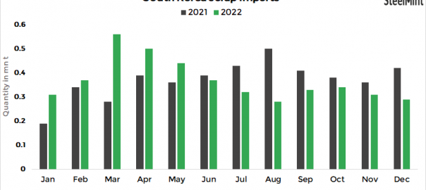 - South Korea’s ferrous scrap imports stood at 4.42 mnt in CY’22, almost stable (-1%) y-o-y compared to 4.46 mnt recorded in CY’21.