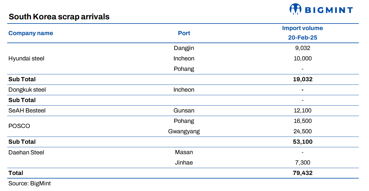 SteelDaily: The total volume of imported ferrous scrap at South Korea’s major ports fell to 79,432 tonnes (t) in mid-February, down by 20,000 t from the previous week.