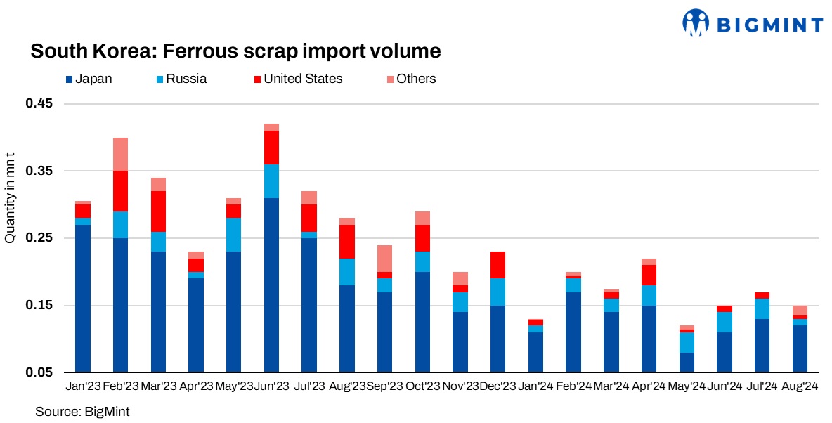 - In Aug’24, South Korea’s ferrous scrap imports fell to 148,768 t, down 11% m-o-m from 166,372 t in Jul’24. Compared to Aug’23 (277,603 t), imports dropped by 46% y-o-y.
