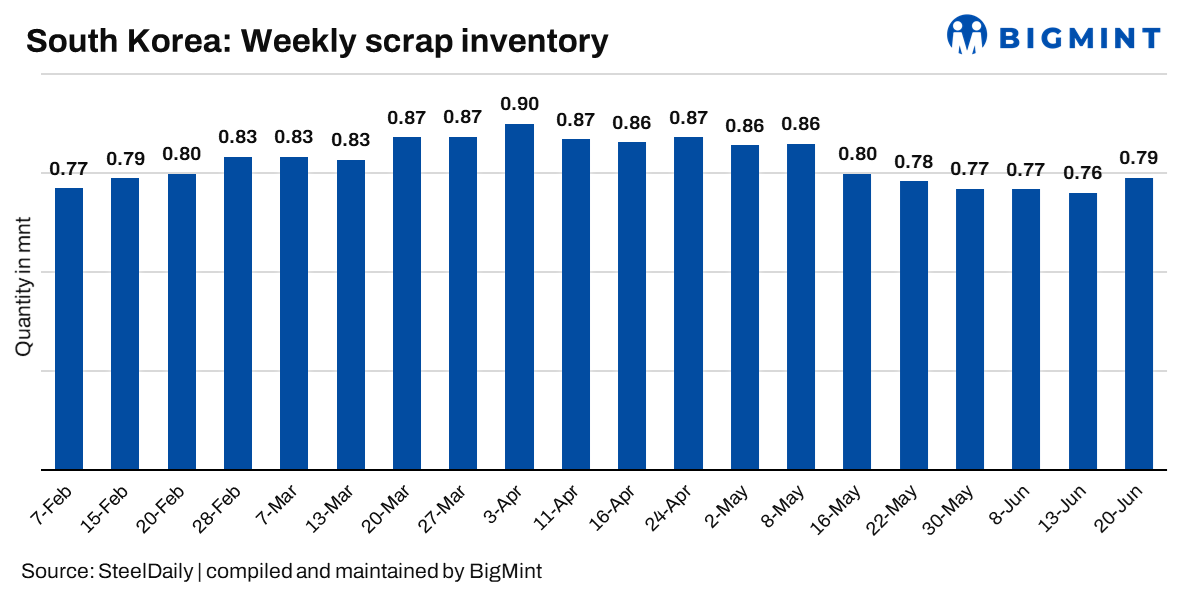 Meanwhile, June scrap inventory by year stood at 774,000 t which is over 100,000 t less than the average of 899,000 t recorded from 2020 to 2023.