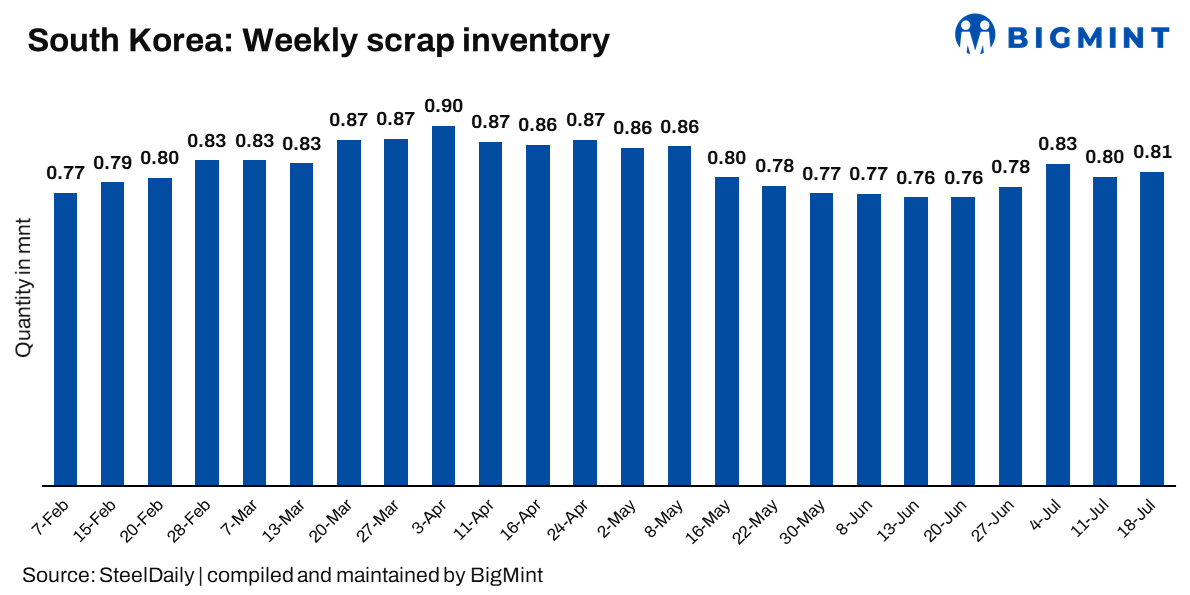 South Korea: Ferrous scrap inventory at major mills rises marginally by 1% w-o-w