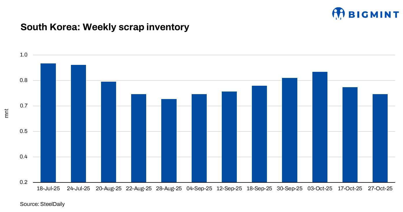 SteelDaily: The cumulative ferrous scrap inventory at eight major South Korean steelmakers declined this week in late October to about 723,000 tonnes (t), down 5.8% w-o-w from 767,000 t.