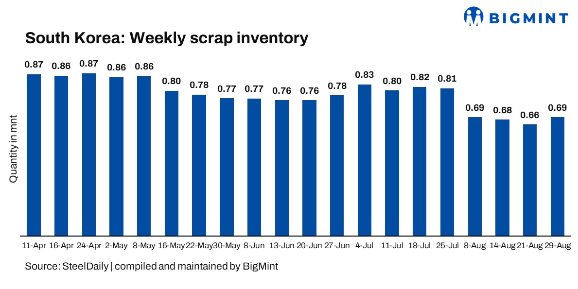 SteelDaily: This week, the combined ferrous scrap inventory of eight major South Korean steel mills reached 692,000 tonnes (t), marking an increase of 5% w-o-w from 668,000 t, observed for the first time in four weeks since late July. This rise was attributed to a partial rebound in special and contract purchases, which particularly benefited steel mills in the southern region.