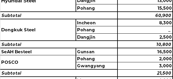 Hyundai Steel: At Incheon, Dangjin, and Pohang, Hyundai Steel reported a total of 60,900 t of scrap received. Incheon received 32,400 t, Pohang 13,000 t, and Dangjin 15,500 t. This is an increase of about 3,000 tonnes from last week.
