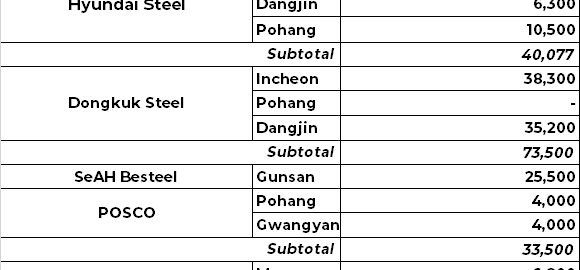 - POSCO: Only 8,000 t was imported by POSCO from Pohang and Gwangyang. Despite the fact that POSCO’s imports of scrap are not improving, it sourced 36,000 t of HBI via Pohang.