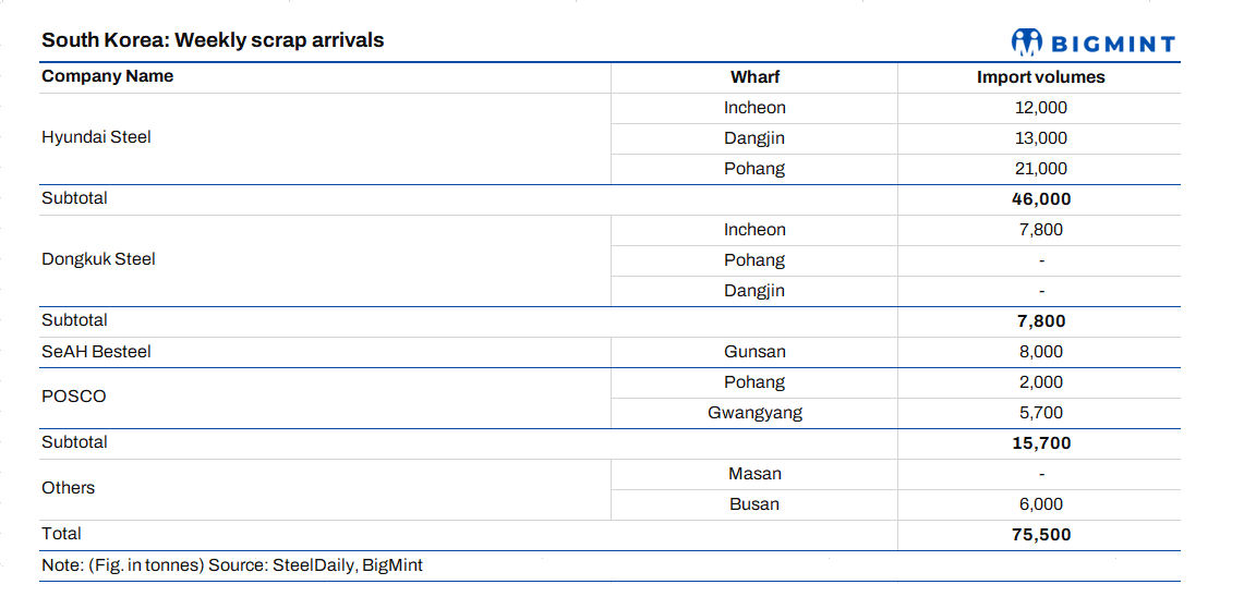 This week in South Korea, new scrap arrivals amounted to about 75,550 t, down from 84,328 t last week, marking about 10% decline. Hyundai Steel received 46,000 t, up 2,000 t. Dongkuk Steel and SeAH Steel decreased to 7,800 t and 8,000 t, respectively. POSCO’s arrivals rose to 7,700 t from 3,500 t. YK Steel imported 2,000 t after a long gap, and Daehan Steel’s arrivals were reduced to 2 cargoes from 3 cargoes in the previous week.