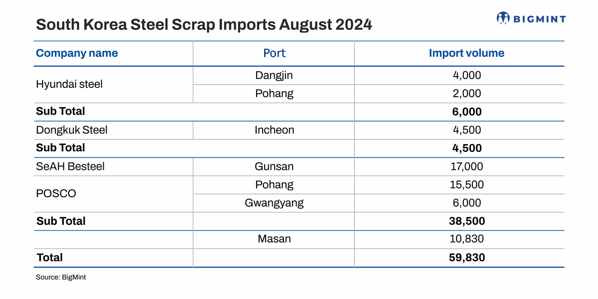 • POSCO, experiencing a rise in import volumes since mid-July, reported a total of 21,500 t. It comprised 15,500 t at the Pohang facility and 6,000 t at Gwangyang.