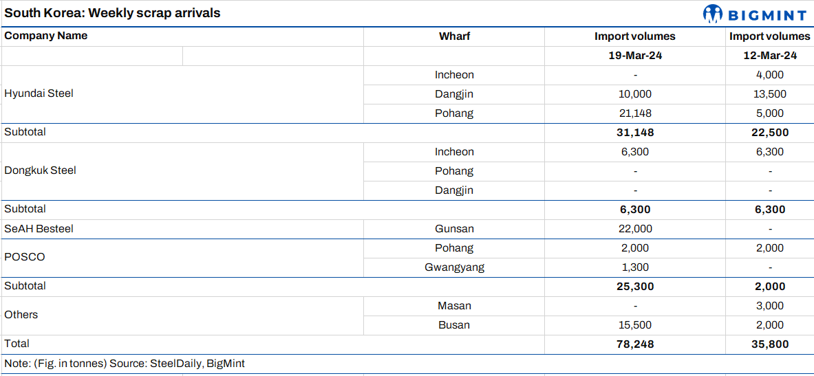 This week, the new iron scrap arrivals surged in South Korea to 78,248 t, a substantial rise from the 35,800 t recorded on 12 Mar’24. Daehan Steel and SeAH Besteel led the increase, while Hyundai Steel reported arrivals at Dangjin and Pohang Works. Notably, Masan Port received no iron scrap arrivals.