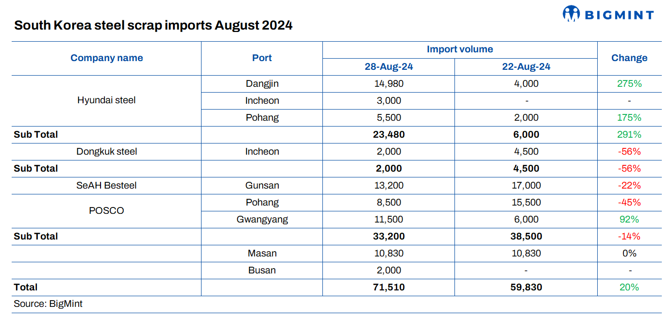 • Hyundai Steel’s fresh scrap arrivals totalled 23,480 t, distributed across several ports: 3,000 t at Incheon, 14,980 t at Dangjin, and 5,500 t at Pohang. This reflects a substantial increase of around 17,000 t compared to the previous week.