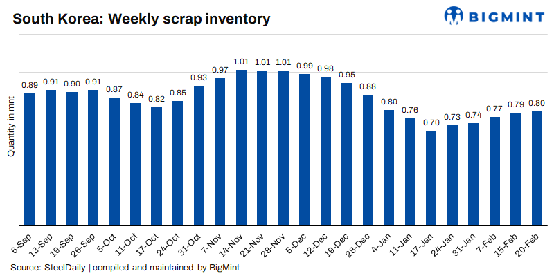 Additionally, POSCO, which typically maintains a larger inventory of iron scrap, decreased by 4.8% compared to the previous week as it commenced inventory adjustments. Within the industry, significant repairs are underway at Korea Steel, scheduled to conclude on the 21 February, as well as at Hyundai Steel’s 90-t electric furnace (until 26 June) and Dongkuk Steel’s Incheon plant’s 100-t electric furnace (starting on the 26 February). Observers are keenly monitoring how these developments will impact market dynamics.