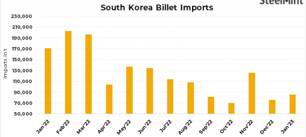 - South Korea’s steel billets imports increased by 13% m-o-m to 85,394 t in Jan’23 compared to 75,590 t in Dec’22, as per customs data maintained with SteelMint.