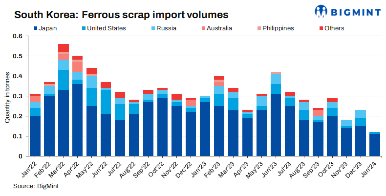 Imports from Japan fall 26% m-o-m: In January 2024, South Korean mills experienced a notable decline in scrap imports from Japan, receiving around 108,368 t. This represents a 26% decrease compared to December 2023, when imports amounted to 146,345 t. Moreover, on an annualised basis, imports plummeted by 59% from January 2023, which saw imports totaling 265,811 t.
