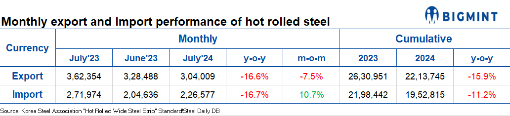 South Korea’s HRC exports, imports show downtrend in Jul’24