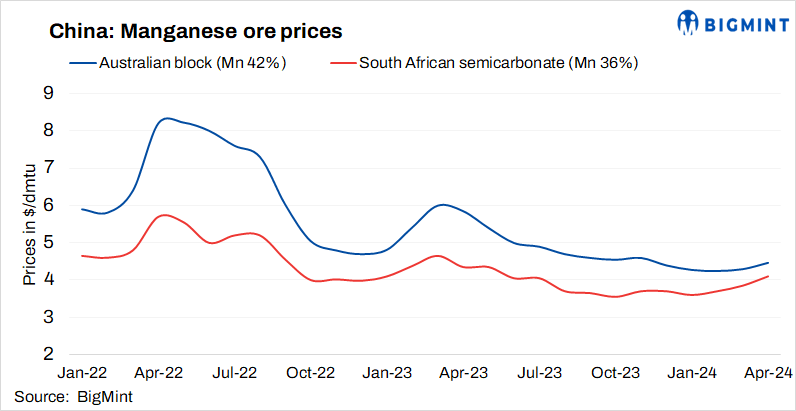 South32 Ltd, the world’s leading miner has increased the offering price for its 37% grade South African manganese ore lump to $4.30/dmtu CIF China for May shipment, a $0.20/dmtu increase. Additionally, the price for its 36% grade South African semi-carbonate lump remained stable at $4/dmtu CIF China.