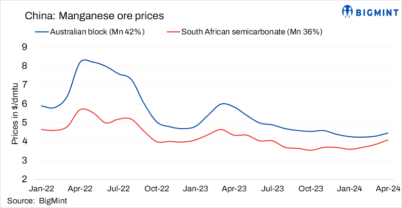 South32 Ltd increased the offering price for its 42% grade Australian manganese ore lump to $4.47/dmtu CIF China for April shipment, a $0.17/dmtu increase. Additionally, the price for its 36% grade South African semi-carbonate lump is now at $4.1/dmtu CIF China, up by $0.25/dmtu. The price rise can be attributed to an anticipated uptick in electricity tariff by 12.74% from Apr’24 by NERSA.