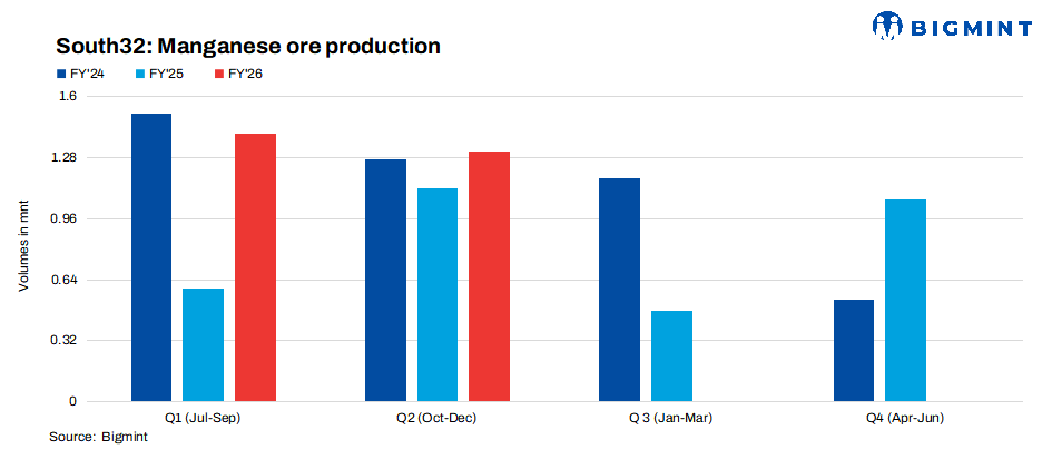 In Q2FY’26, South32’s manganese ore production declined q-o-q to 1.312 mnt (wet basis), driven by a 6% drop in Australian output to 0.806 mnt and an 8% fall in South African production to 0.506 mnt. Despite the q-o-q decline, the company maintained its FY’26 guidance. Meanwhile, production surged 58% y-o-y in H1FY’26.