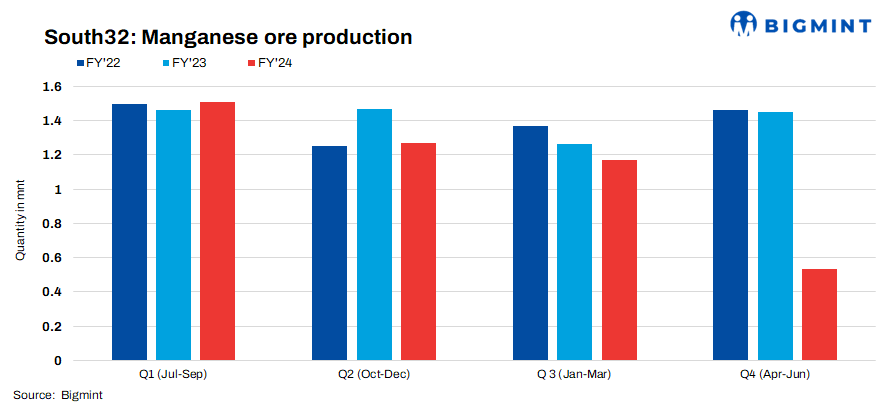 In Q2CY’24, South32’s manganese ore production decreased by 55% q-o-q to 0.534 wmnt. Australian manganese production temporarily suspended operations in March 2024 due to the impacts of tropical cyclone Megan. However, South African manganese production remained stable with slight increase by 1%, reaching 0.534 wmnt, as the operation delivered improved mining performance and lifted output of secondary products to capitalise on stronger manganese prices.