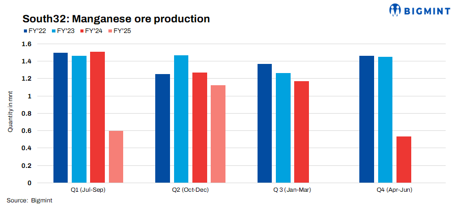 South32’s manganese ore production soared by 88% q-o-q to 1.124 wet million tonnes (wmnt) in Q2FY’25 and increased by 38% y-o-y in H1FY’25 due to production resumption in Australia. However, sales decreased by 16% q-o-q to 0.498 wmnt. Meanwhile, the production guidance for FY’25 remains unchanged for Australian and South African manganese ore operations.
