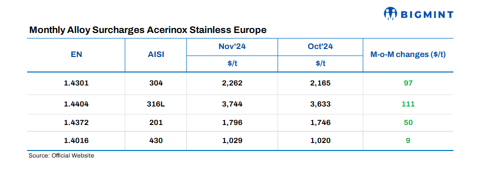 Acerinox recently announced stainless steel flat product surcharges for Nov’24 deliveries. Current prices are as follows: