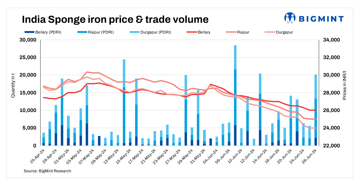 Sponge iron prices in all key locations in India decreased by INR 100-200/tonne (t) on 26 June, 2024.