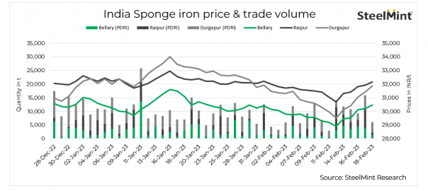 Sponge iron prices in India continued to rise further today. They were up by INR 50-600/tonne (t) in key locations as suppliers quoted higher. However, prices in Bellary witnessed a slight drop of INR 50/t. Producers were forced to raise their offers in some markets today due to strong purchase inquiries and rising prices in the Punjab market. But, overall, a limited number of deals were concluded today. Because of the higher offers, market participants were less active today than they were yesterday. As a result, about 9,170 tonnes (t) of sponge iron transactions were recorded today in India as against 27,500 t on 17 February.
