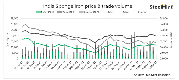 Sponge iron prices dropped in the range of INR 50-250/t in key locations today. Due to the ongoing downturn in steel prices in north India, specially Punjab, prices kept dropping as spot transactions remained low.