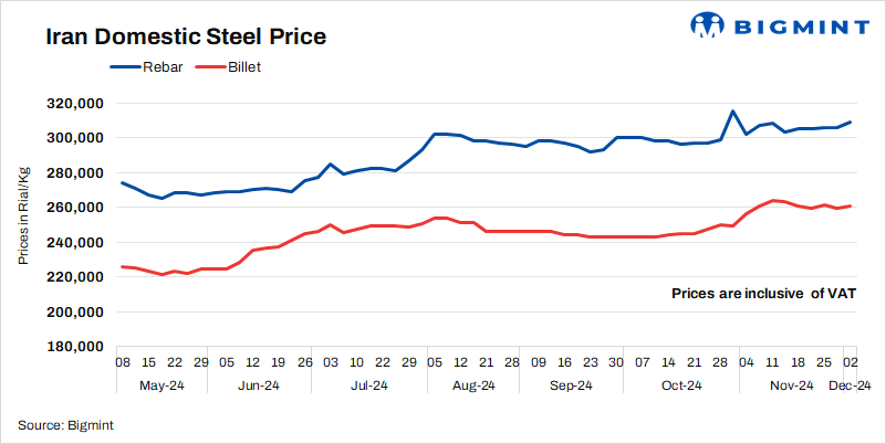- Billet prices rose by 1,000 Rial/kg to 260,500 Rial/kg on 2 Dec’24 as against 27 Nov.
