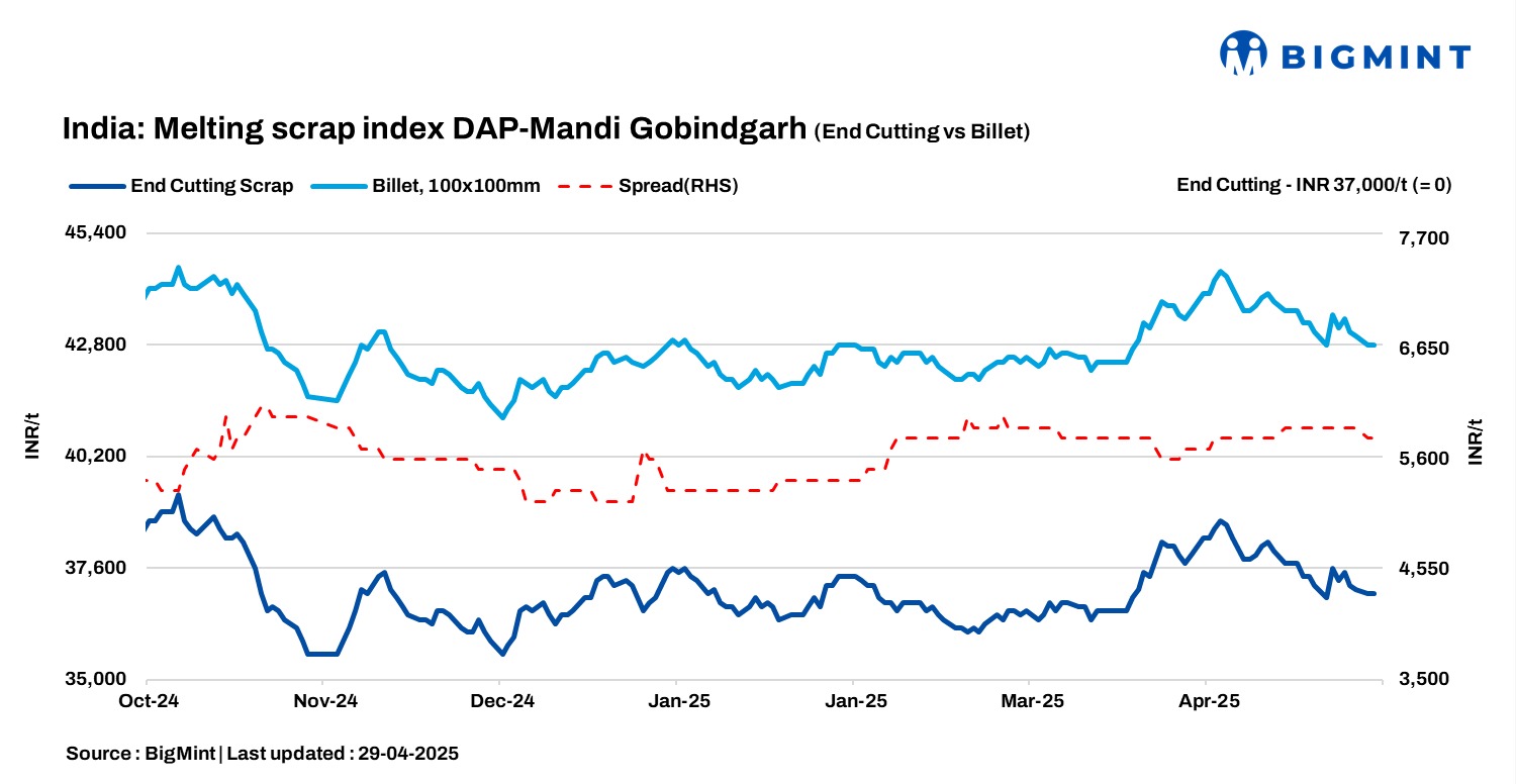 BigMint’s domestic end-cutting scrap index for the Mandi Gobindgarh market held firm d-o-d at INR 37,000/tonne (t) DAP on 29 April 2025, reflecting a stable demand-supply balance and muted trade movements.