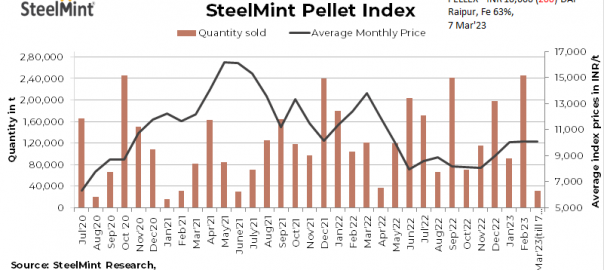 SteelMint’s bi-weekly domestic pellets (Fe 63%) index, PELLEX, decreased by INR 200/t to INR 10,000/tonne (t) DAP Raipur compared to the last assessment on 3 March, 2023. No deal was reported in this publishing window due to low buying interest as market participants were quiet ahead of Holi festival.