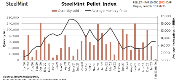 SteelMint’s bi-weekly domestic pellets (Fe 63%) index, PELLEX, stood at INR 10,000/tonne (t) DAP Raipur, inching down by INR 100/t compared to the last assessment on 7 February, 2023. No deals were reported in the current publishing window. Most of the buyers kept away from making fresh bookings on falling sponge prices and anticipation of drop in pellets offers in the near-term.