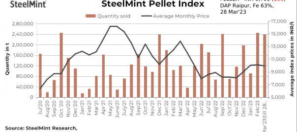 SteelMint’s bi-weekly domestic pellets (Fe 63%) index, PELLEX, decreased by INR 100/t to INR 9,700/tonne (t) DAP Raipur today compared to the previous assessment on 24 March, 2023. One deal of 10,000 t was heard at INR 9,650/t in this publishing window. Other than that market participants were silent as the current financial year is nearing its end.