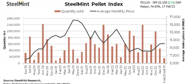 SteelMint’s bi-weekly domestic pellets (Fe 63%) index, PELLEX, stood at INR 10,100/tonne (t) DAP Raipur, increasing by INR 150/t compared to the last assessment on 14 February, 2023. Around 25,000 t of deals were reported in this publishing window. Trade volumes improved this week in comparison to the previous week — which was rather subdued.