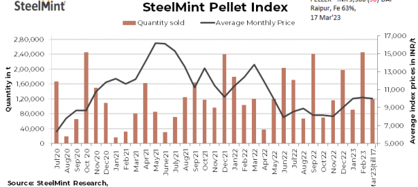 SteelMint’s bi-weekly domestic pellets (Fe 63%) index, PELLEX, decreased marginally by around INR 50/t to INR 9,900/tonne (t) DAP Raipur today compared to the last assessment on 14 March, 2023.