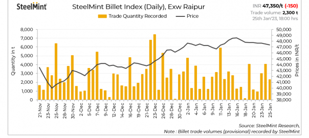 SteelMint’s billet index decreased marginally by INR 150/tonne (t) to INR 47,350/t exw-Raipur on 25 January, 2023.